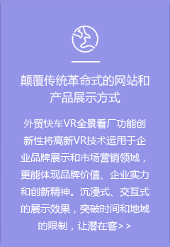 提升企業(yè)形象,VR看廠結(jié)合外貿(mào)快車網(wǎng)站產(chǎn)品展示,并可以在VR看廠點(diǎn)擊WEBSITE回到外貿(mào)快車網(wǎng)站里,提升轉(zhuǎn)換,獲取詢盤。