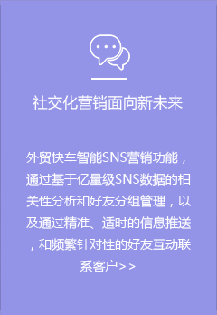 潛在采購商和詢盤客戶,都進(jìn)行SNS深度挖掘了解企業(yè)情況。SNS可以讀取外貿(mào)快車網(wǎng)站上的產(chǎn)品進(jìn)行發(fā)布,發(fā)布后留下該產(chǎn)品的網(wǎng)址讓有興趣的用戶再點(diǎn)擊進(jìn)入外貿(mào)快車網(wǎng)站,為外貿(mào)快車網(wǎng)站帶去流量,再轉(zhuǎn)換成詢盤。同時(shí),SNS營銷系統(tǒng)又可以進(jìn)行商業(yè)公司挖掘,挖掘出的商業(yè)公司與潛在采購商進(jìn)行數(shù)據(jù)對比融合,更進(jìn)一步撐握企業(yè)情況,再進(jìn)行精準(zhǔn)聯(lián)系,獲得SNS詢盤。